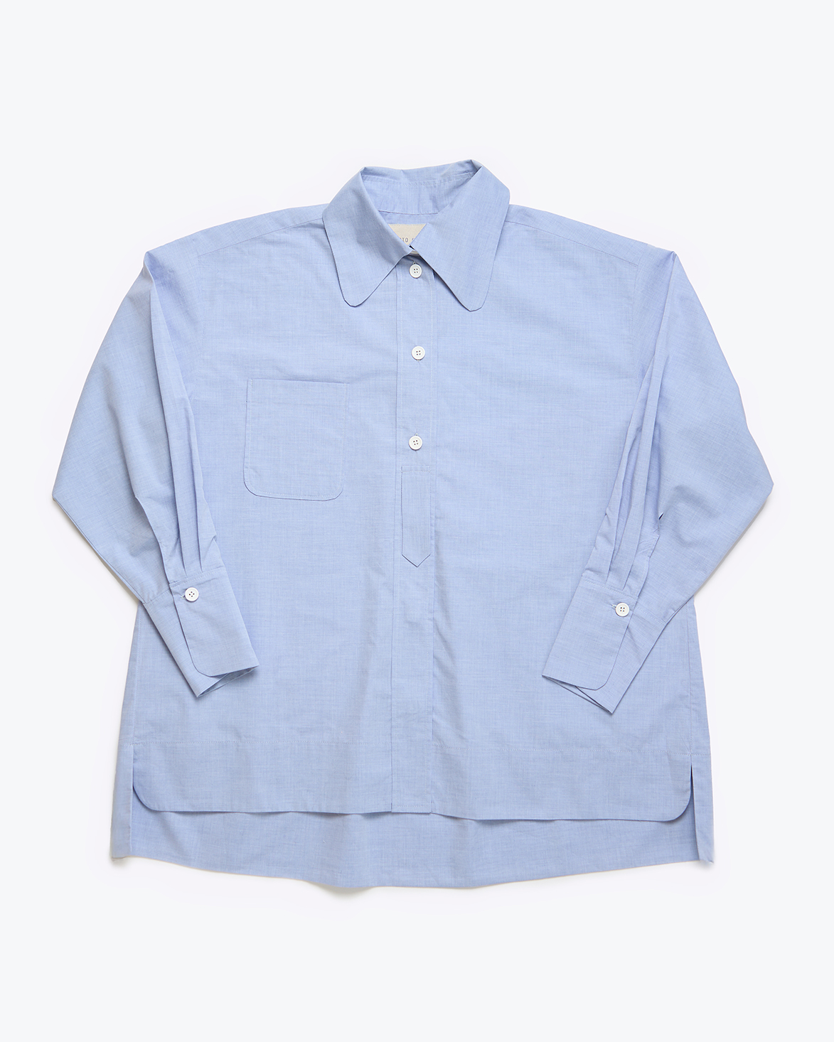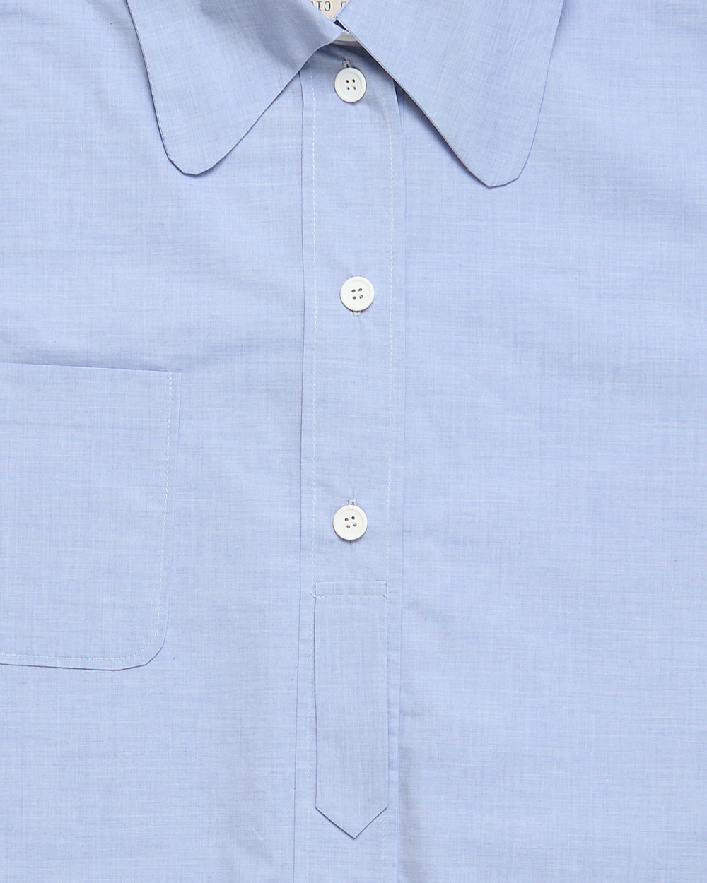 Cotton poplin shirt, with a big « pelle à tarte » (« tart server ») collar, a button pad on the front and a small pocket pad on the top right hand side. The buttons are made out of antique glass. This feminin design is available in off-white and blue, one-size only.