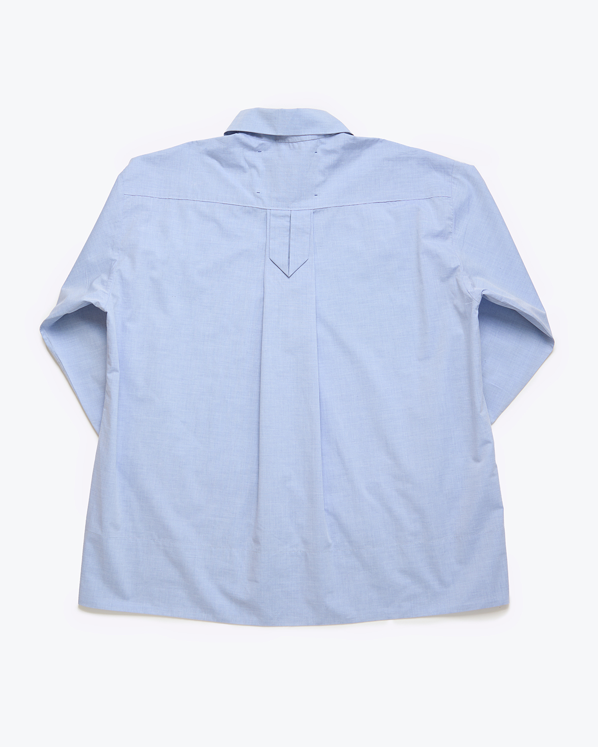 Cotton poplin shirt, with a big « pelle à tarte » (« tart server ») collar, a button pad on the front and a small pocket pad on the top right hand side. The buttons are made out of antique glass. This feminin design is available in off-white and blue, one-size only.